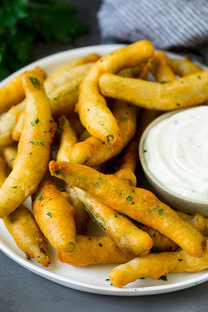 Deep fried green beans make a stellar appetizer for parties and game day. Serve with: